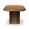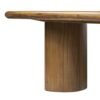 The table rests securely on two cylindrical pedestal bases, crafted from the same solid wood, adding a sculptural element to the overall look. These pedestal legs offer not just stability but also ample legroom, making it comfortable for longer seating sessions. The subtle grain and natural imperfections of the wood surface add authenticity and character, ensuring that each piece is one-of-a-kind.